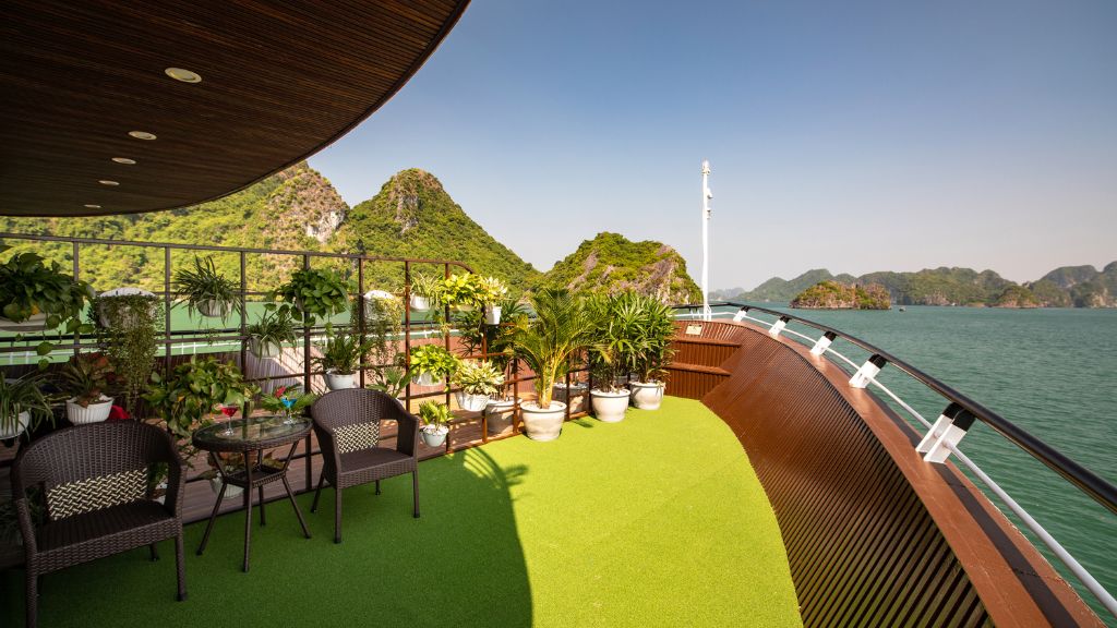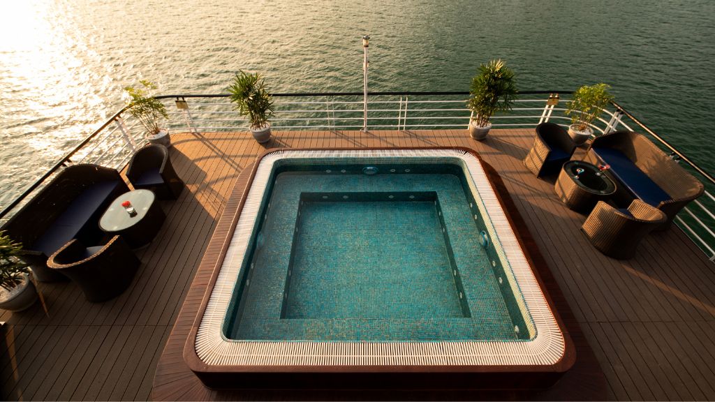 17:30 – 18:30: Quý khách quay lại du thyền để tự do giải trí, ngắm hoàng hôn, bể bơi ngoài trời và thưởng thức trà chiều, trái cây tươi.
