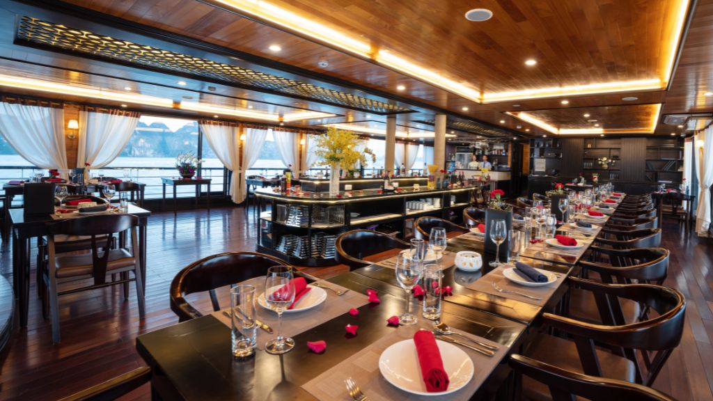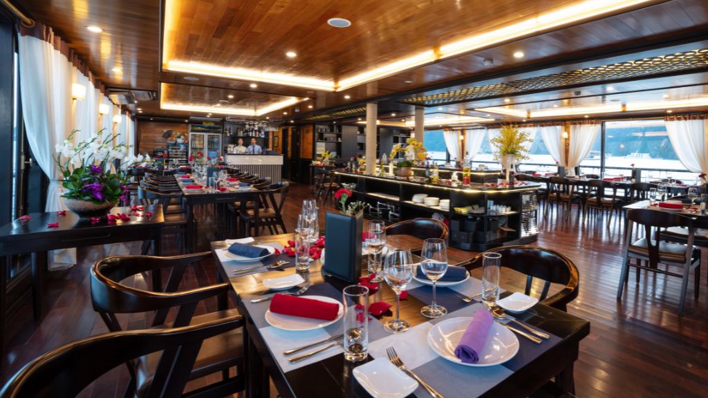 13:00: Bữa trưa sẽ được phục vụ tại nhà hàng trong khi du thuyền đang lướt trên Vịnh Hạ Long - Lan Hạ tráng lệ, chiêm ngưỡng những kiến tạo đá hấp dẫn trong vịnh.