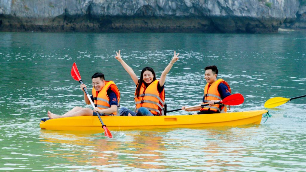 14:30: Du thuyền đưa bạn đến khu vực Ba Trái Đào. Ở đây bạn sẽ tham gia hoạt động kayaking. Sau đó quý khách di chuyển về du thuyền tham gia bơi, tắm nắng.