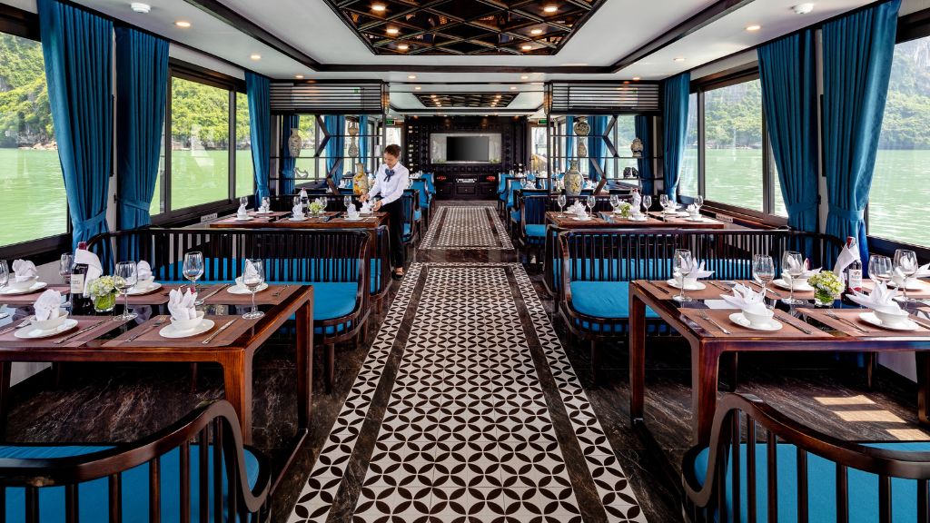 13:00 Quý khách thưởng thức bữa trưa tại khu vực nhà hàng của du thuyền.
